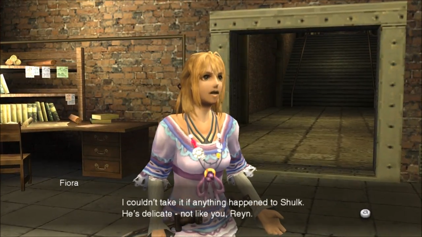“Are you OK?” Fiora asked, relaxing a little as Shulk righted himself. “Does it hurt?”