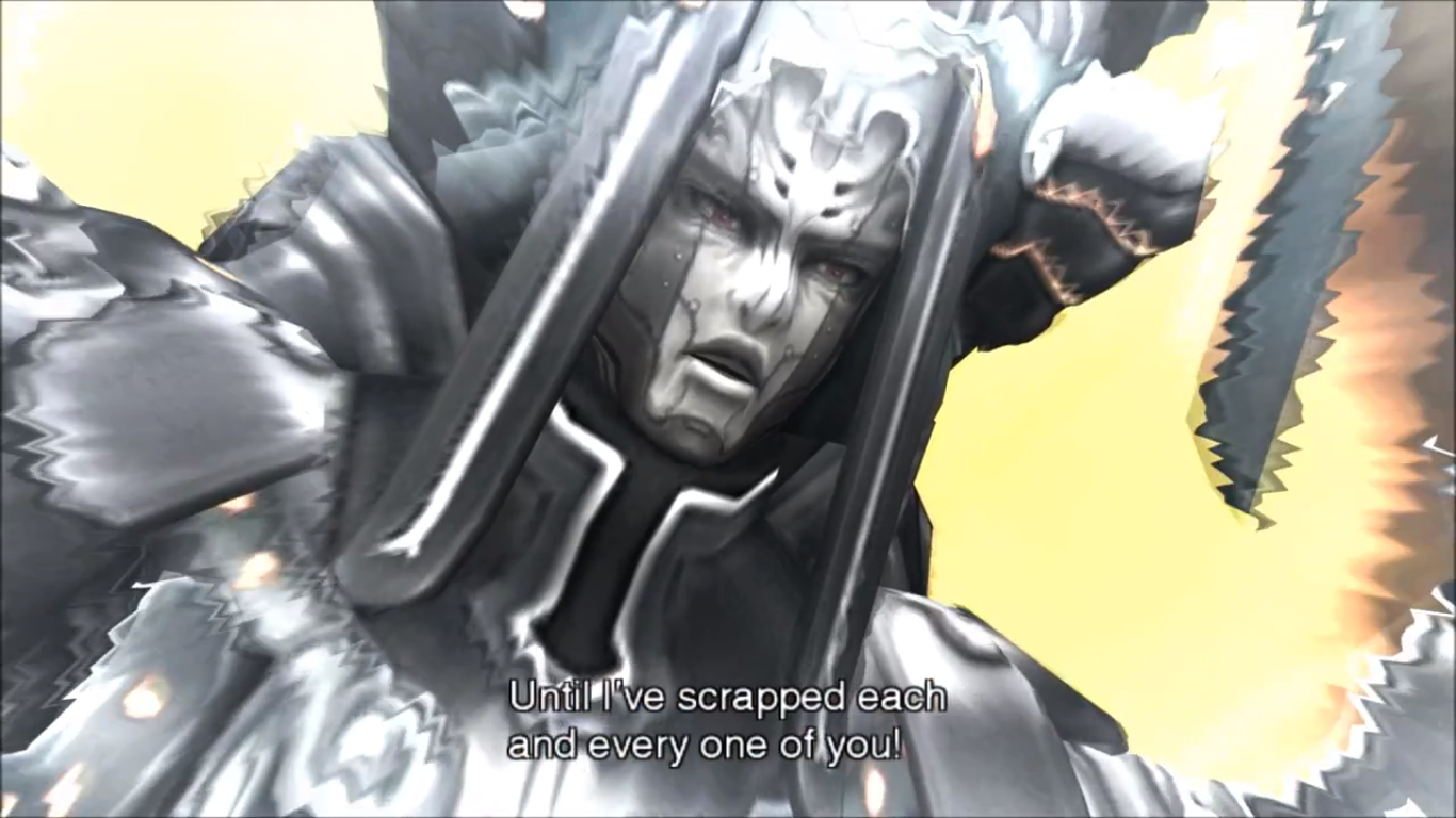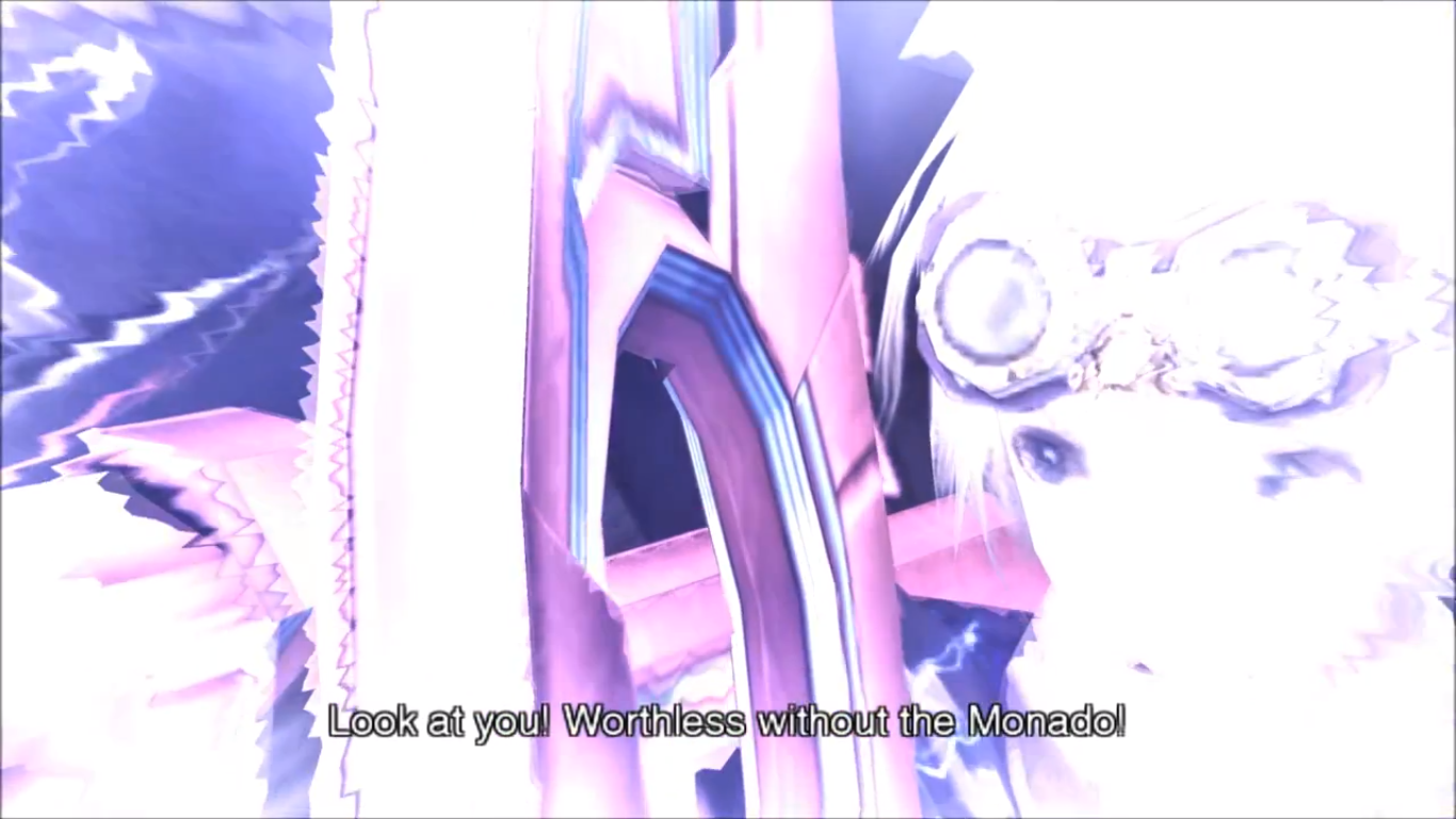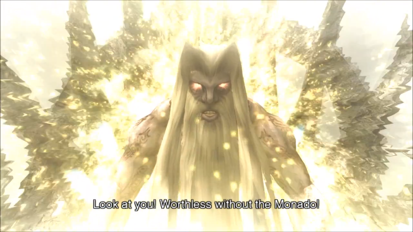 “Look at you!” Shulk saw himself, using the Monado to block someone else’s blade. The voice sounded somewhat familiar, and it filled him with a sense of anger. “Worthless without the Monado!” The images changed, and Shulk was standing before a giant with red eyes and purple skin, looking down at him and covered in a yellow-orange light.