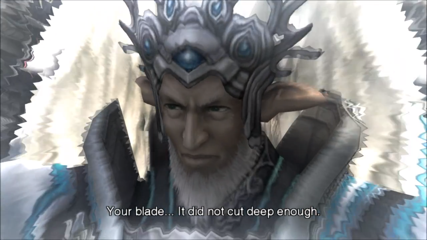 “Your blade…” A deep voice interrupted and Shulk saw an ancient-looking man who appeared to have wings sprouting from the top of his head. The man turned away as the image changed and the voice continued. “It did not cut deep enough.”