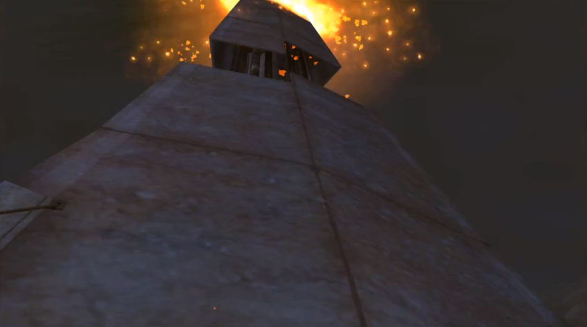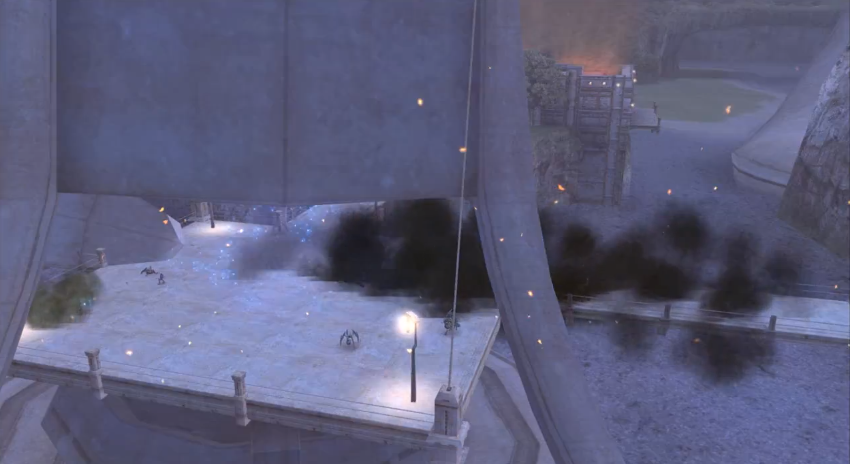 “Tell me about it,” Reyn agreed, shaking his head. He and Shulk looked up sharply at the sound of an explosion. The top of the tower standing above the Central Plaza had been hit by a Mechon blast and was now falling directly towards the boys.