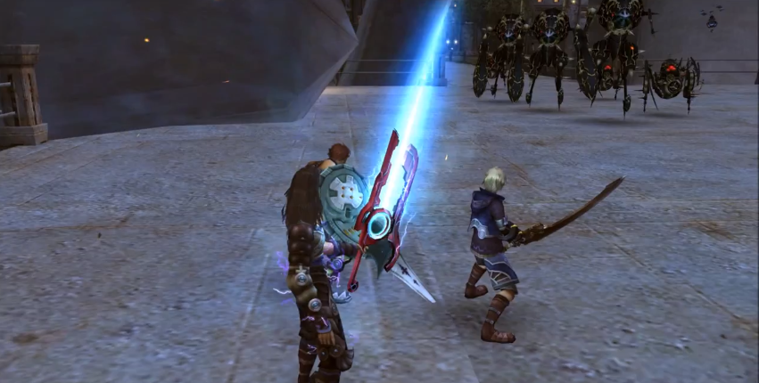 Reyn and Shulk backed into the centre of the plaza as the Mechon surrounded them. “That was a close one,” said Shulk.
