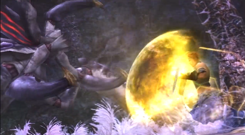 “Right!” Shulk readied the Monado as the giant arachno approached them. Shulk quickly cast his newfound power on himself as it reared up to hit him; yet again, it merely bounced off the ball of yellow light. “It looks like this new power protects us from harm!” he called.