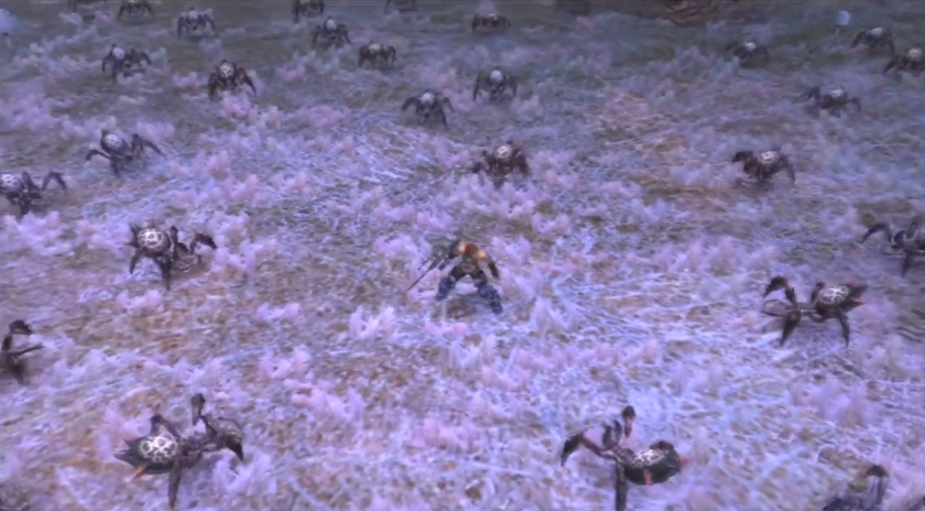 Reyn, meanwhile, was looking for a way out, and not seeing one. “There’s too many of ‘em! I kill one, and ten more pop up!” He blocked a string of web with his shield and ran towards the other end of the cavern, away from Shulk.