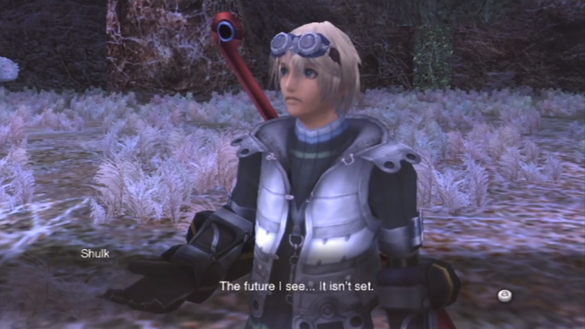 “Yeah… A warning about what will happen. What will happen if I don’t do anything, or…” In his mind’s eye, Shulk saw Metal Face, “…if I can’t do anything.” Sounding more determined, he went on, “So I can use this power to change the future. And that’s exactly what I intend to do.”