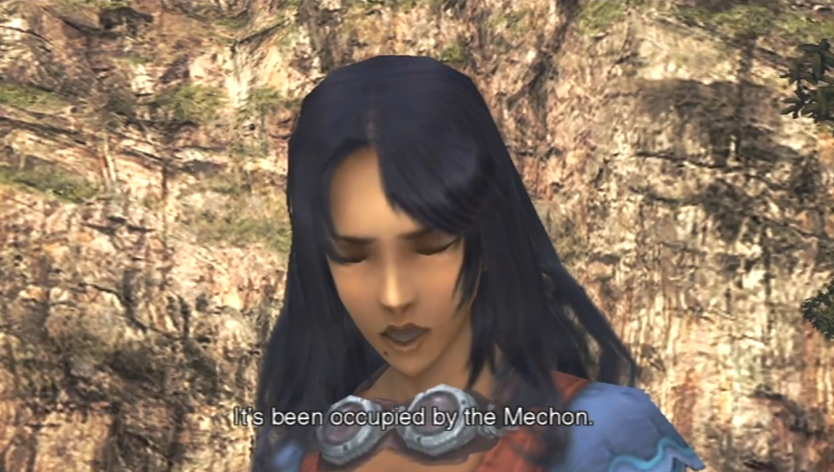 “Juju!” Juju was caught in a Mechon’s claw, the raven-haired woman running towards him; the vision changed, and she was the one falling into its claw. A Mechon with a face – different from the one which had attacked Colony 9 – turned to look at Shulk. Shulk blinked as he dropped back to the present, trying to process what he just saw.