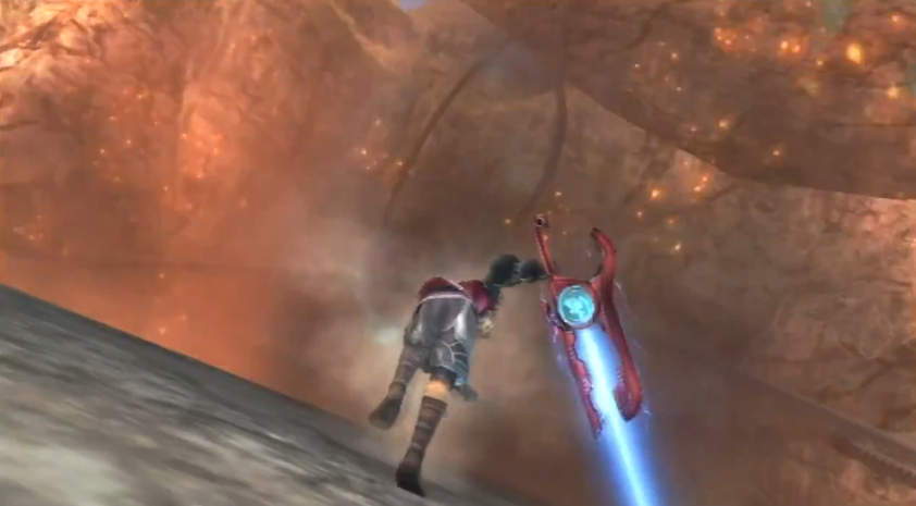 Shulk nodded and unsheathed the Monado. “…There may be Mechon as well.” Reyn pulled out his gunlance, and the three travellers continued through Kisk Cave, on high alert. Vangs flitted about their heads, but left the trio alone. They hit upon a small cavern, in which rested a huge ether deposit.