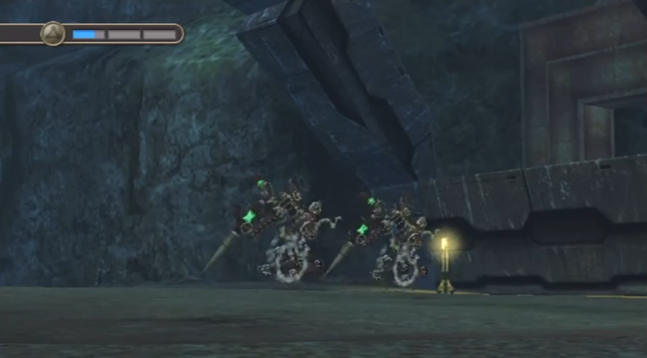 As Shulk and Reyn ran forwards, ether bullets flew past their head, sinking into the body of the scout. The M67 units turned in time to see the boys’ weapons come crashing down on their heads, cracking them open. This caught the attention of the three Mechon opposite them, who then began to hurry towards the party.