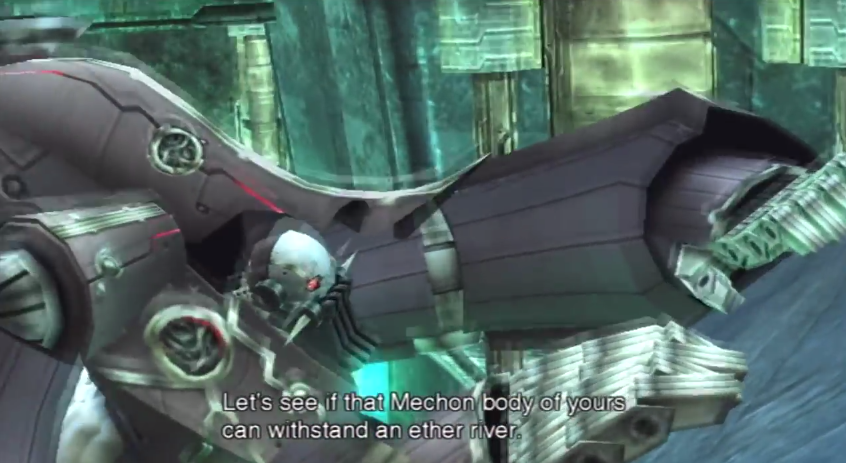 “No, I don’t,” said Otharon. “But I can do this!” He sent one of his claws flying into the pillar behind them, which exploded. Otharon backed away as the ground started to give way. Xord was struggling to rise, but by now it had tilted too much, and the Mechon started to slip. “Let’s see if that Mechon body of yours can withstand an ether river.”