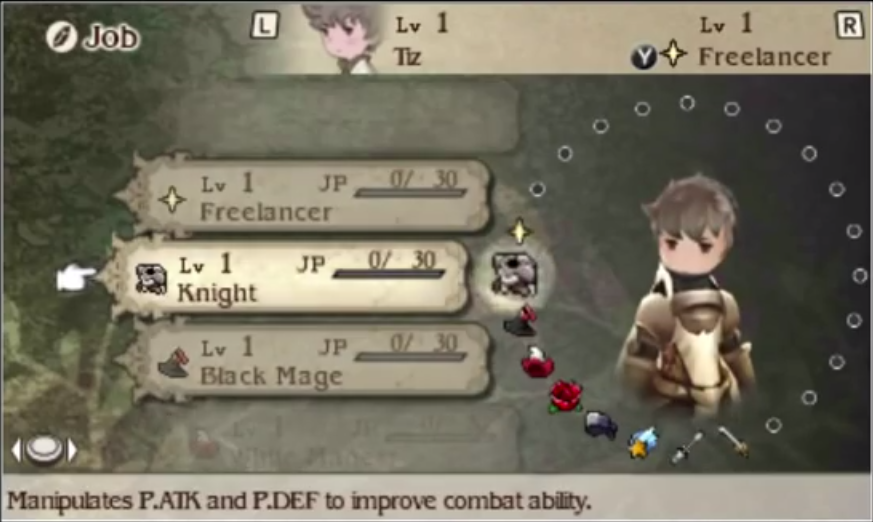 Job levels cap at 14, and each level up earns you new skills. Skills fall into two types; those which can be used in battle, and support skills. Subclasses can be set, so you can use in-battle skills from one other job. The number of skills you have available from your subclass depends on how much you have leveled up that class; a subclass which you have previously maxed out will give you access to all of their in-battle skills, whereas putting your subclass as one you have never used will only give you access to their most basic skill.