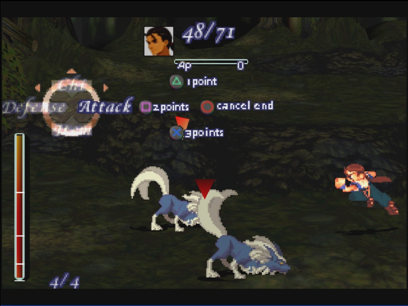 On the side of the battle screen is a bar telling you how many moves each character can make per turn. Each character is only allowed a certain number of moves; you start with three and by the end of the game will have seven. The triangle button uses up one, the square button two, and the X button three. You can press circle at any time after your first attack to end your turn, which will build up your AP bar. Building up the AP bar will allow you to unleash a number of deathblows on your opponent all at once in a single turn. Its downside is that building it up quickly means giving up a few turns. Aside from attacking or using skills, there are also options to defend, use an item or escape. These are all self-explanatory, and take up your entire turn.