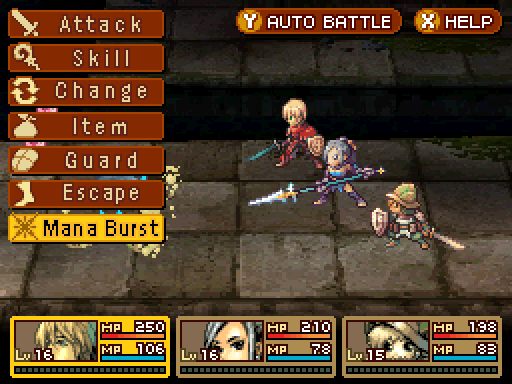 Other options on the battle menu include your standard attack, using skills which you learn as you level up, using an item, guarding, escaping and using up your Mana Burst bar. The Mana Burst bar for each character fills as they attack and as they take damage. When it’s full, they get an option to use a Mana Burst attack. Each character gets three of these attacks, which they gain as you advance the story. One of these is Turn Break, which was mentioned above as an attack which destroys a single enemy’s turn. The other two are unique to each character.