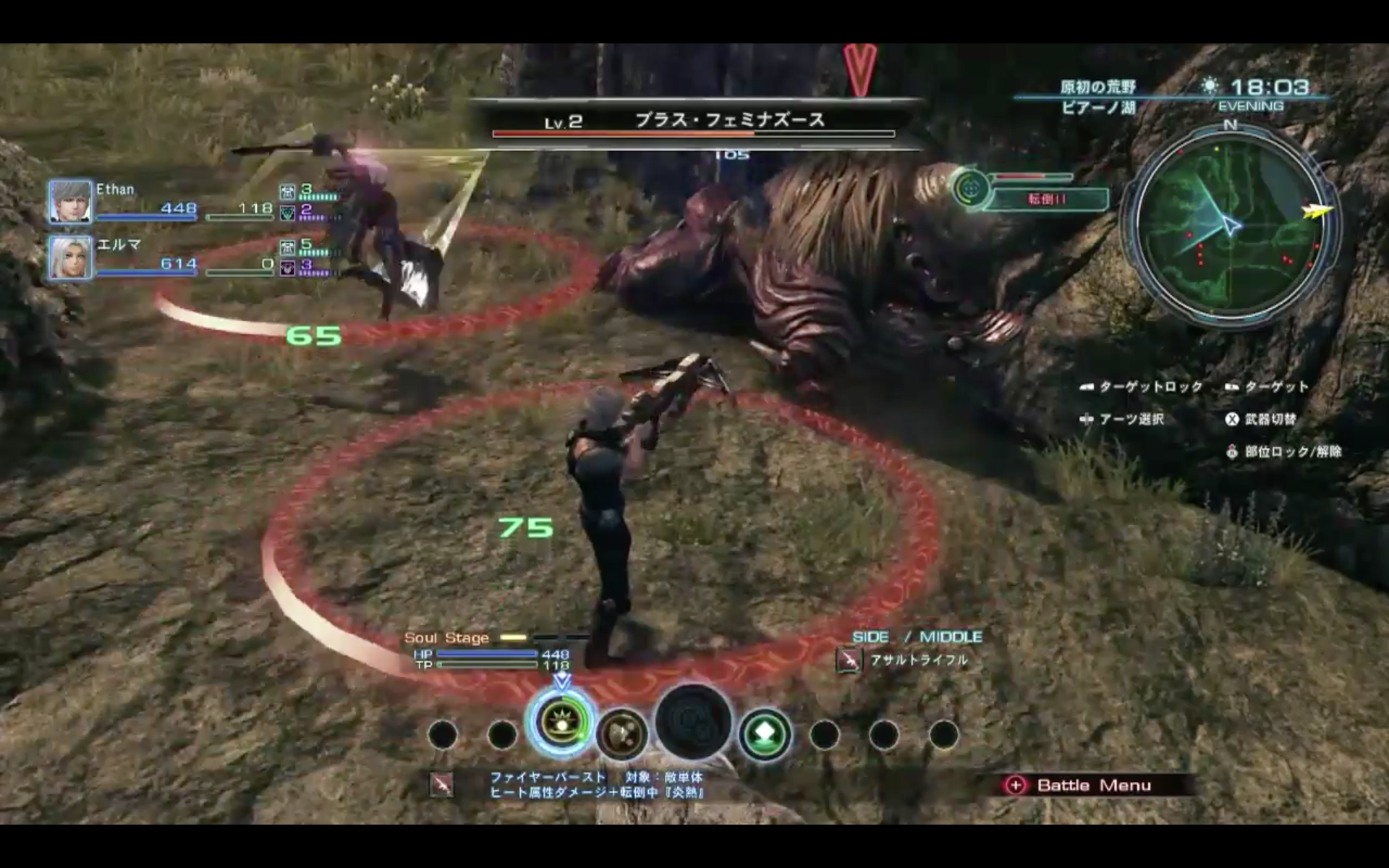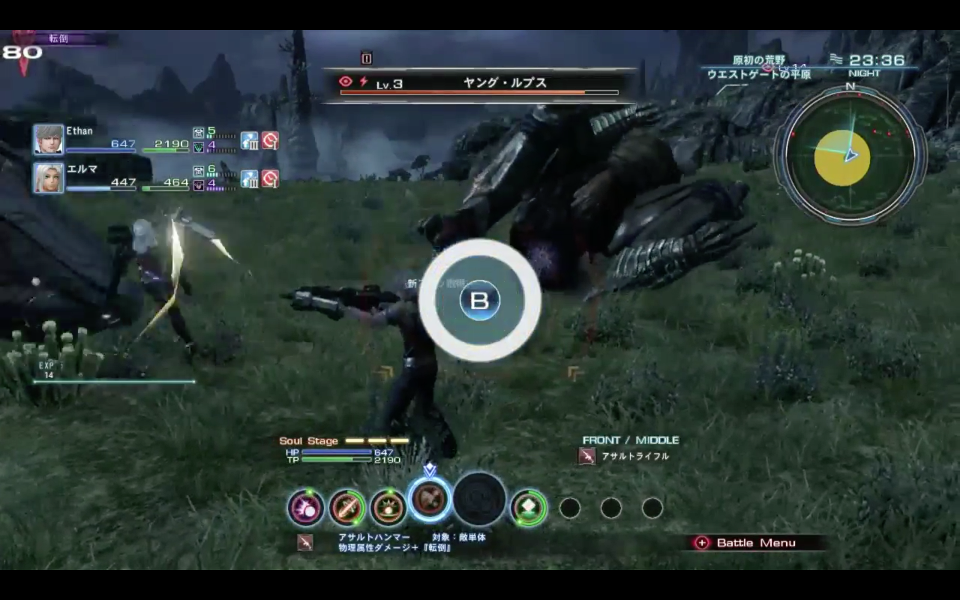 Those of you who have played the first Xenoblade will be very comfortable with the layout. We have an art palette on which you can put eight arts, and the big circle in the middle is used to initiate the battle. It’s possible to switch from ranged to melee attacks on the fly; I’m not certain how this is done, but from what I saw in the E3 2014 treehouse demos you just select the big circle in the middle.