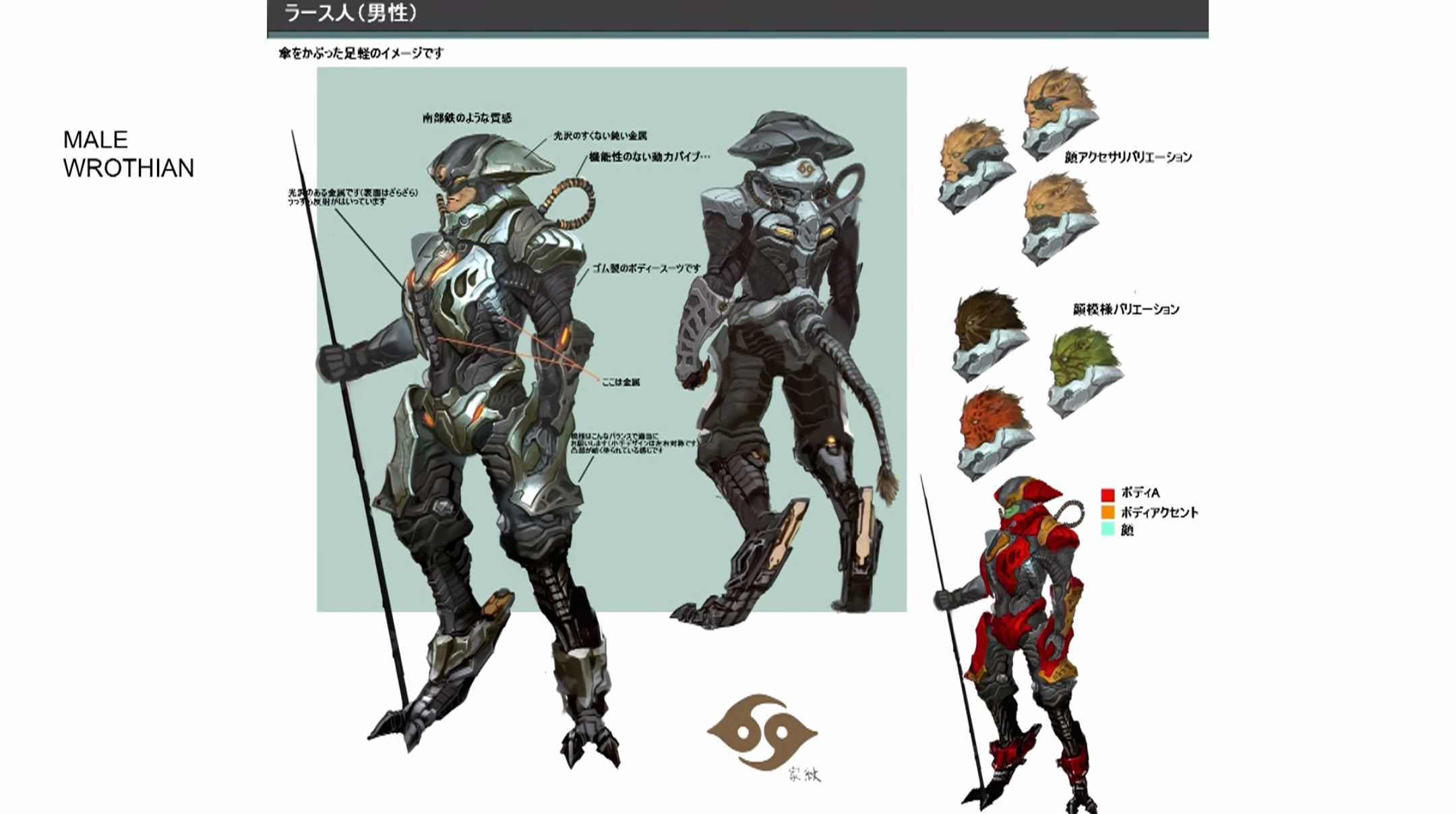 This symbol is the crest of the Wrothians, and actually represents a binary black hole system, which sounds so awesome. Pictured below are conceptual images of first their skell, then female Wrothains, male Wrothians, armour based on their god of war (yes, the races in Xenoblade X even have their own mythos), and a general armour set from the Wrothians.