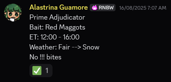 Fishers gather on a Discord server called Fisherman’s Horizon, or, more simply, Fishcord. There is a spreadsheet for each new fish, with a table of all the possible weather conditions and baits usable at that spot. People who are willing to help will sign up to be testers, meaning we’re happy to be notified whenever there’s an important testing window coming up. Initially, we’ll be notified by the spreadsheet chief when any rare weather windows will be up soon. Once we’ve narrowed down the conditions for a fish (because someone got a bite or catch), the notifications end up being for all viable windows. We’ll fish in a window till someone catches it or we’ve fished enough to be able to confidently rule it out.